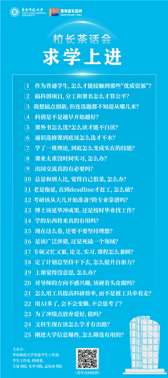 作为普通学生,怎样接触到更多优质资源?在科创项目中,怎么分工和署名才算公平?我想搞点创新,但连选题都不知道该从哪来,怎么办?……关于“求学上进”中的25个高频痛点问题,校长逐一拆解。