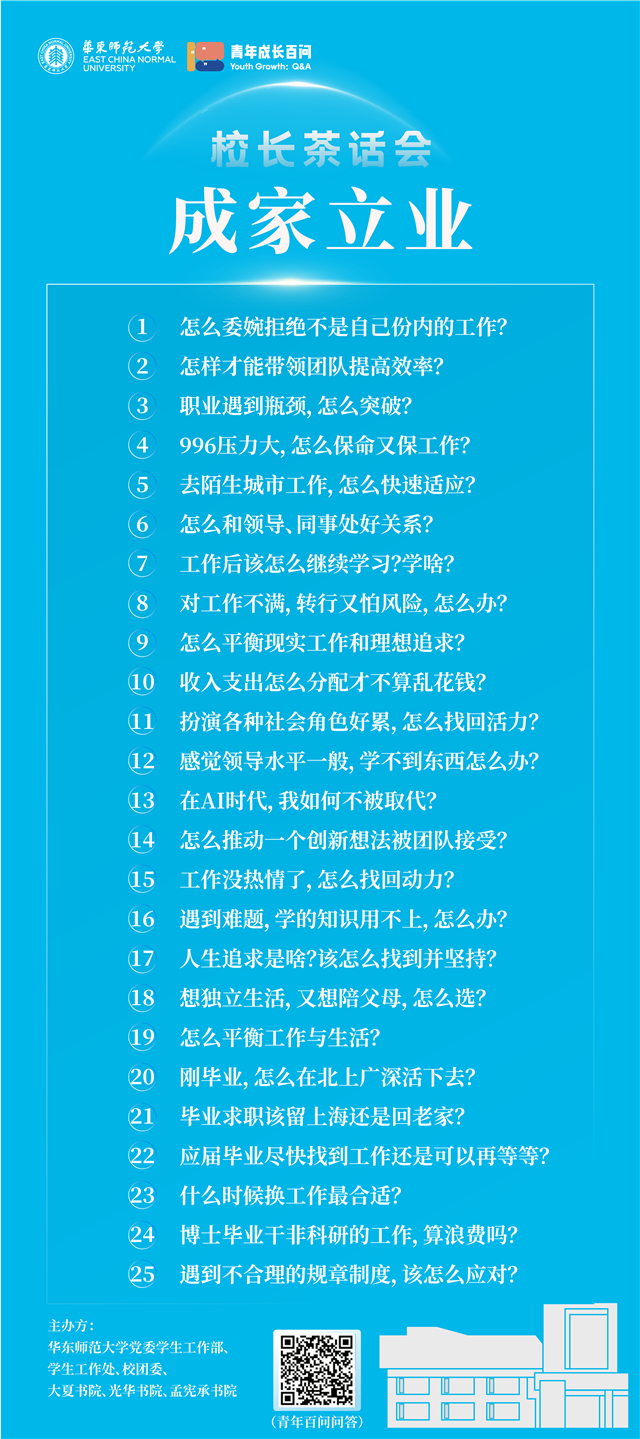 去年,beat365英国官网网站启动了“青年百问”调研项目,面向18-35岁青年征集问题,让成长发展中常遇的困惑能被精准回应。本月,beat365英国官网网站校长钱旭红院士应邀围绕“求学上进”“成人自立”“融入社会”“成家立业”“未来教师”“生涯发展”主题,将连续参加六场“青年百问”校长茶话会,与在校师生开展深度对话。首场“求学上进”主题座谈已在上周五于大夏书院开讲。钱旭红结合自身丰富阅历,将首批25个求学高频痛点问题逐一拆解。金句迭出、回应有力,而被师生高赞为“宝藏校长”的清醒回答。