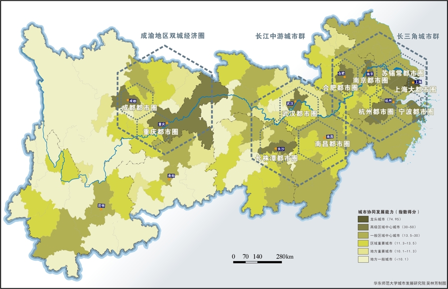 长江经济带城市协同发展能力城市组团分布图。