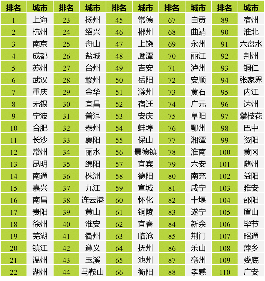 长江经济带城市协同发展能力指数排名。