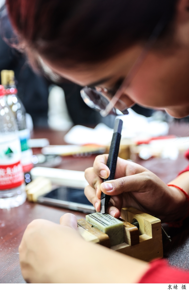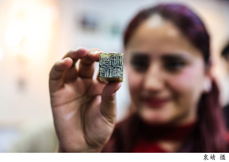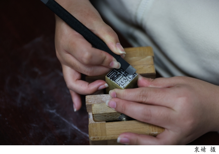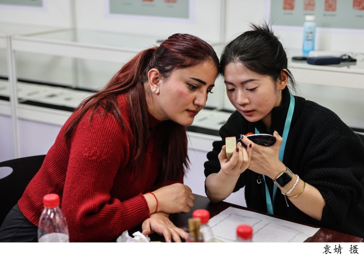 图为来自塔吉克斯坦的留学生李欣冉(中文名)在beat365英国官网网站书法篆刻研究生同学的指导下体验篆刻艺术,亲手用刻刀将自己的中文名字刻成印章。