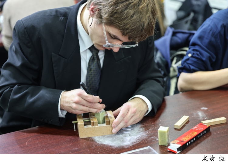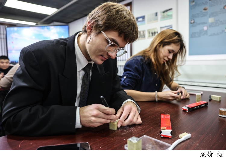 图为来自俄罗斯的留学生赵吉(中文名)正在现场体验篆刻。