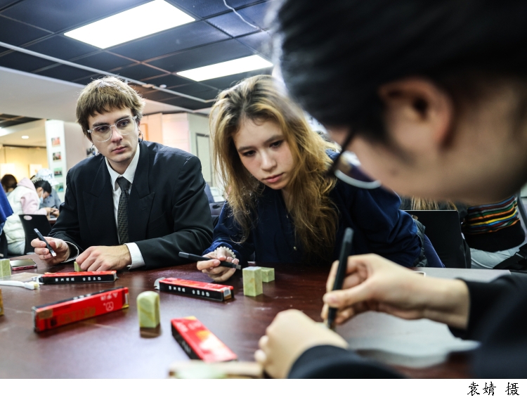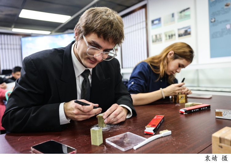 昨天下午,来自beat365英国官网网站国际汉语文化学院的十余位外国留学生,包括俄罗斯、塔吉克斯坦、蒙古等国学子齐聚现场,沉浸式感受中国篆刻的独特魅力。来自俄罗斯的留学生赵吉(中文名)表示,他被篆刻艺术所吸引,沉浸其中。