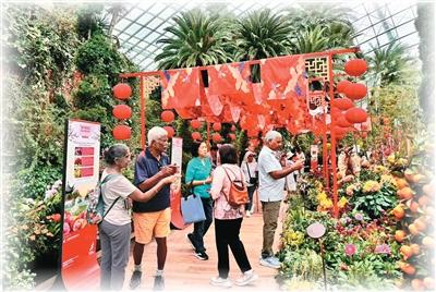 丙午马年春节,新加坡滨海湾花园“春花盛开之骏马奔腾”花展,游客欣赏“帆影花廊”一景。/上海建工园林集团供图
