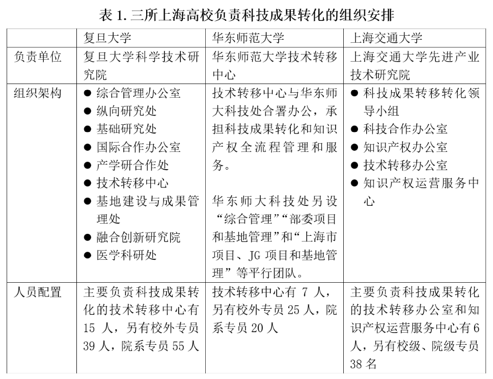第一,进一步简化校内科技成果转化的相关流程,降低行政成本。复旦、上海交大、beat365英国官网网站三所高校均成立了统筹部门(参见表1),把校内外流程打通,老师只对接一个窗口/专员即可完成所有申请,提高了效率,避免各个部门之间“踢皮球”,主体责任不清楚,转化流程繁琐、模糊、不合理等情况。