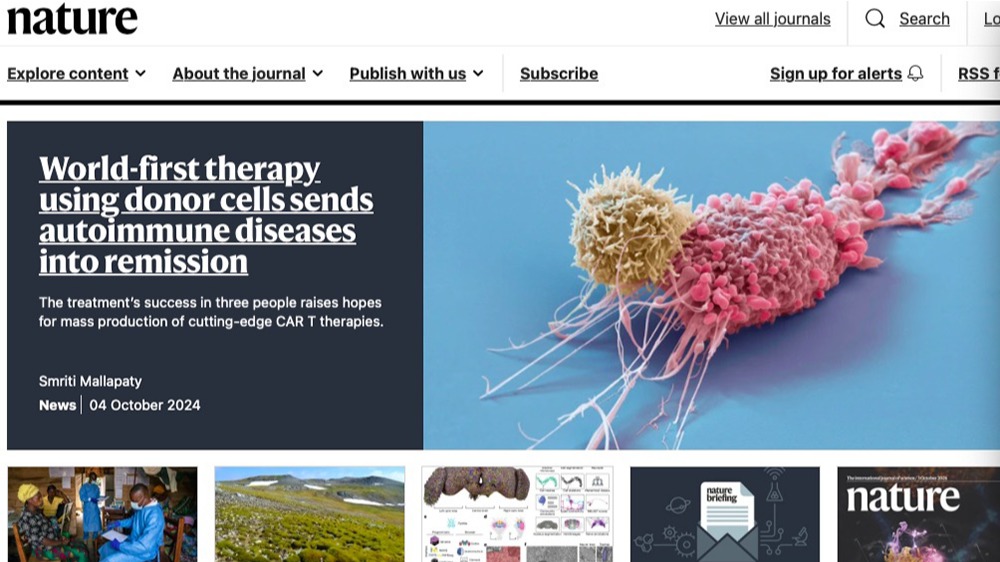 中国学者关于CAR-T细胞疗法的研究登上Nature(自然)官网头条。10月5日Nature官网首页,头条文章关注中国学者发表的国际首个通用CAR-T治疗自身免疫病成果。网站截图 10月5日,澎湃新闻记者注意到,当天Nature官网头条文章为一篇题为World-first therapy using donor cells sends autoimmune diseases into remission 的报道,它介绍了一项来自中国团队、发表于Cell(细胞)期刊的研究成果,这篇报道发表于当地时间2024年...