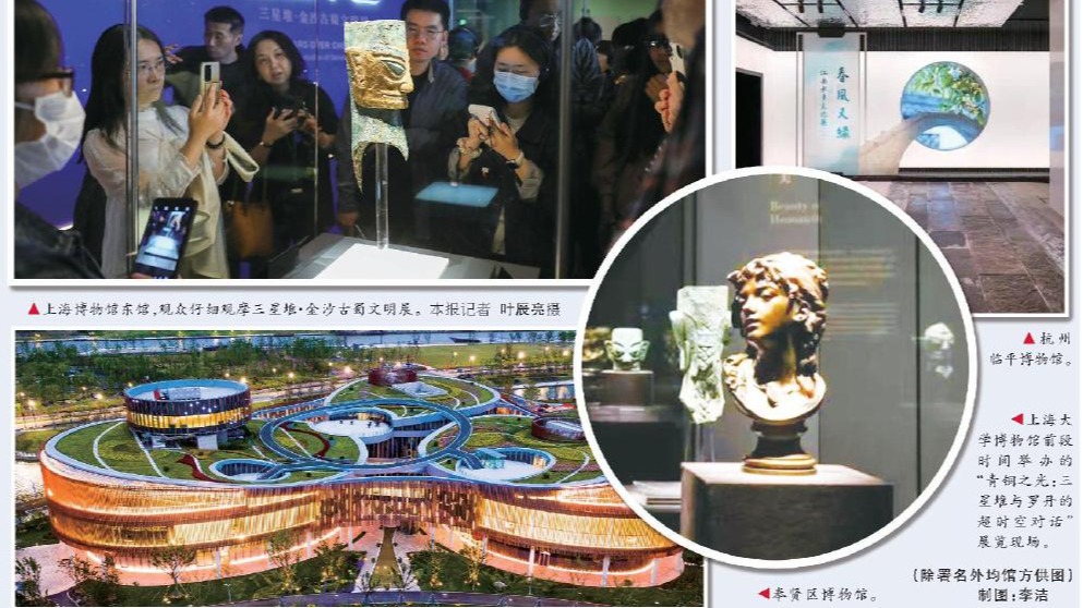 冲着曾跻身全国博物馆十大精品陈列展的“春风又绿——江南水乡文化展”以及上新的特展“易水寒光——东辽金器窖藏展”,上海文博艺术爱好者王小姐上周六特地去了趟杭州,目的地是距市区近30公里的临平博物馆。过段时间,她打算再到地处苏州城郊的吴文化博物馆转转,那里即将启幕的特展“树碑立传:吴中古树名木的故事”让她不禁好奇。上海博物馆东馆,观众仔细观摩三星堆·金沙古蜀文明展。本报记者 叶辰亮摄 杭州临平博物馆...