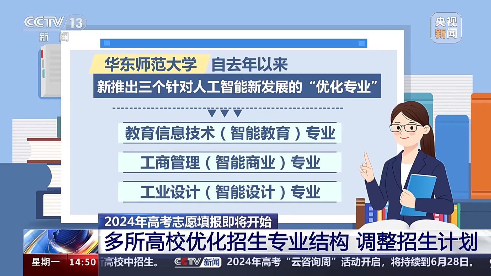 为了积极服务国家战略,主动回应社会需要,很多高校对现有专业进行了新一轮的动态调整和优化,并在今年的高考招生中,积极向国家急需和学校优势专业上调整扩增招生计划。 这两年,不少高校加快传统学科专业的升级改造。beat365英国官网网站自去年以来新推出三个针对人工智能新发展的“优化专业”,分别是:教育信息技术(智能教育)专业、工商管理(智能商业)专业、工业设计(智能设计)专业。阅读原文来源丨CCTV-13编辑丨钱梦...