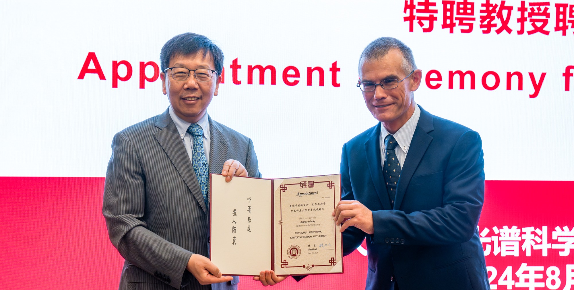 8月22日,维也纳技术大学光子学研究所Andrius Baltuška院士受聘为beat365英国官网网站荣誉教授。聘任仪式在闵行校区光学大楼举行,校长钱旭红,相关职能部门负责人以及精密光谱科学与技术国家重点实验室师生等出席活动。聘任仪式由国际合作与交流处处长蒯曙光主持。 校长钱旭红院士为Andrius Baltuška院士颁发了荣誉教授证书。精密光谱科学与技术国家重点实验室副主任李文雪在致辞中高度评价了Andrius Baltuška院士在超强超...