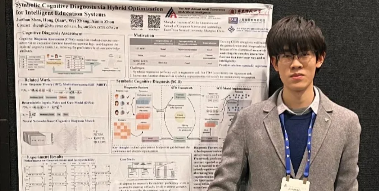 以第一作者身份在CCF-A类国际会议发表论文2篇;荣获神经信息处理系统大会(NeurIPS)2023因果结构学习挑战赛国际冠军;获中国计算机学会大学生学术秀本科组冠军;商汤奖学金提名奖、华鑫奖学金、优秀学生特等奖学金获得者......他是计算机科学与技术学院2021级本科生沈君豪,一起来看看这位本科生是如何玩转“人工智能+教育”。计算机科学与技术学院2021级本科生沈君豪|在不同学科背景的碰撞中成长 沈君豪的科研契机源...