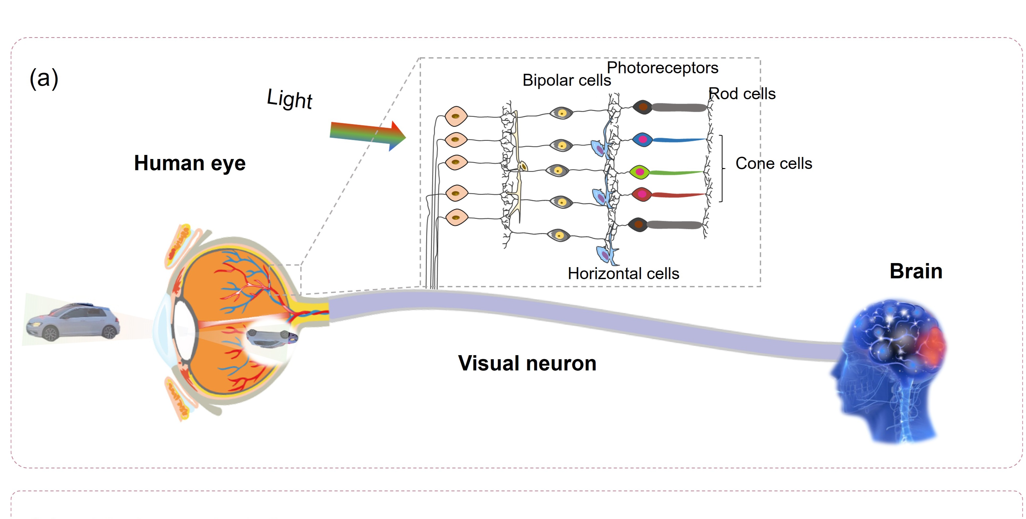 Nano Letters 杂志发表beat365英国官网网站科研团队最新研究成果 人类视觉系统的明适应(图1)是一个奇妙且至关重要的生理过程。借助视觉适应机制,人眼能够在动态环境中高效处理外部信息,极大拓展对光强的感知范围。受人类视觉系统的启发,人工视觉系统(亦称机器视觉系统)在图像感知、存储以及神经形态计算等领域展现出广阔的应用前景。然而,当前的人工视觉器件在光波长响应范围和光强度检测能力方面仍存在局限性,从而影响了其应...