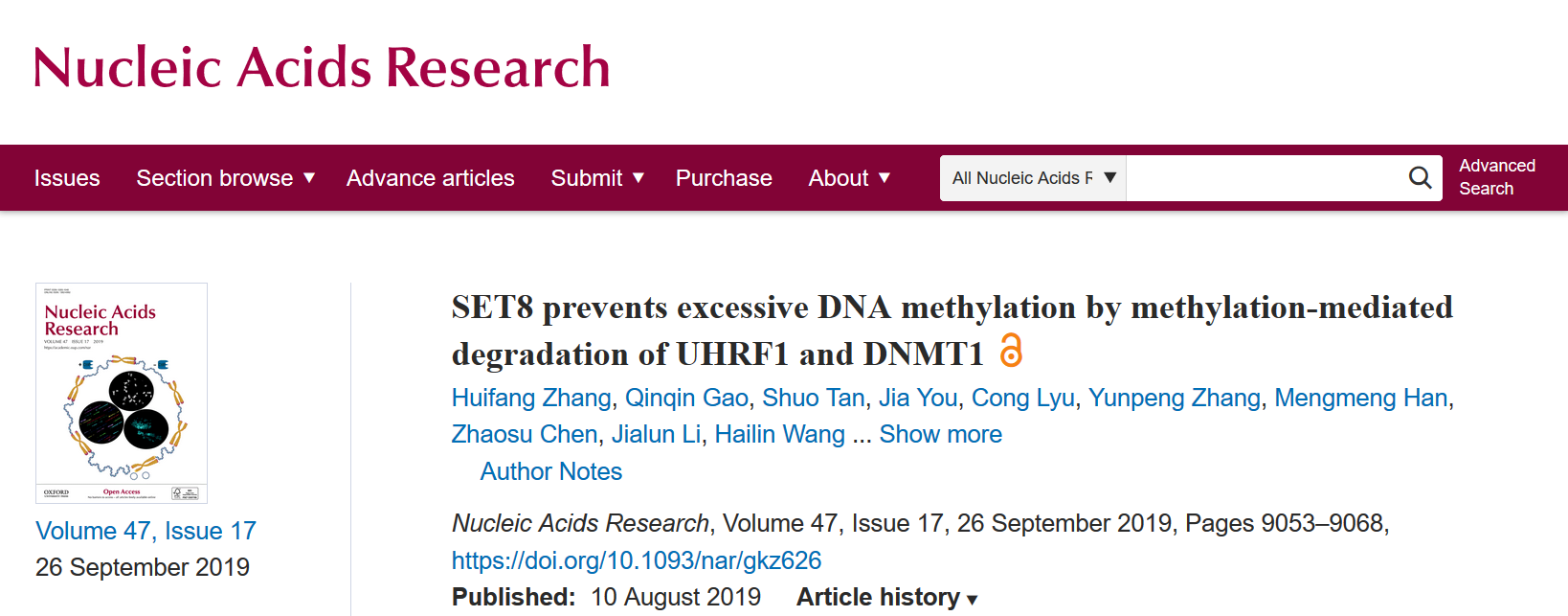 DNA甲基化作为一种重要的表观遗传修饰,其在细胞分裂过程中的稳定传承对于细胞的功能和命运十分重要。大量的研究工作表明DNA甲基化酶DNMT1在一个叫UHRF1的辅助因子的协助下,能定位到DNA复制叉,并以原有的DNA链为模...